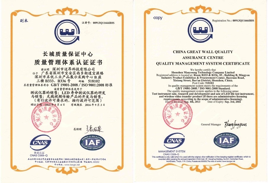 經(jīng)過公司全體同事的通力合作,邁昂科技已經(jīng)順利通過權(quán)威ISO認(rèn)證機(jī)構(gòu)的嚴(yán)格審核,于2013年9月4日正式獲得ISO9001:2008質(zhì)量管理體系認(rèn)證證書。