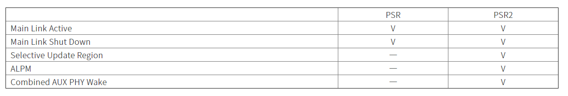 PSR與PSR2最大的差異為面板畫面全部刷新與部份刷新,更進階的PSR2技術(shù)可只刷新局部畫面(Selective Update),由信號端發(fā)送需要刷新的位置通知接收端做對應區(qū)域刷新,代表繪圖處理器僅須傳送少部分需要被刷新的數(shù)據(jù),再加上PSR2同時可支持進階連接電源管理ALPM(Advanced Link Power Management)控制要求接收端能迅速離開待機與睡眠狀態(tài)。