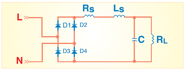 圖2為橋式整流的典型線路。在RLC模式下,用戶可透過設定RLC值,100%模擬實際待測物的行為。圖3&4分別是透過實際被動負載(電阻、電感、電容)與使用RLC負載模式量測。圖5則為定電流模式下所得到的波形。