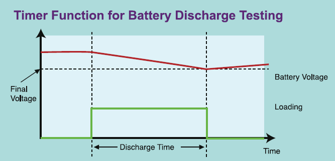 針對電池放電測試,63200A提供使用者三種放電模式 : 定電流、定電阻與定功率模式,并透過設定截止電壓與停止時間(1秒~100,000秒),讓電子負載能正確的停止拉載,確保電池不會因過度放電而損壞。除此之外,在量測方面,能測量電池的放電電量(WH、AH)與總放電時間。舉例說明 : 當按下Load ON開始拉載,63200A系列的內部計時器會開始進行計數,直到電池電壓降至所設定的截止電壓或按下Load OFF停止拉載,計時器才會停止計數。電池放電測試功能亦可應用在超電容的放電時間測試和其他相同應用等。