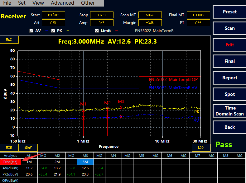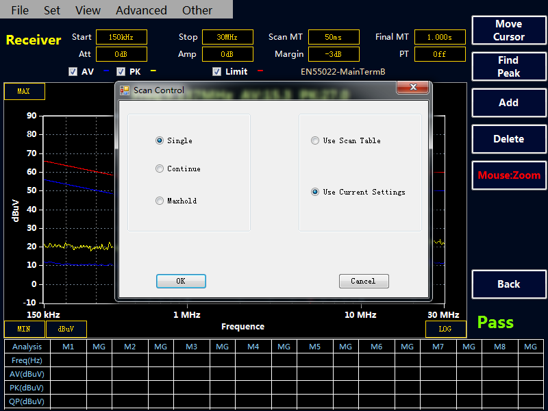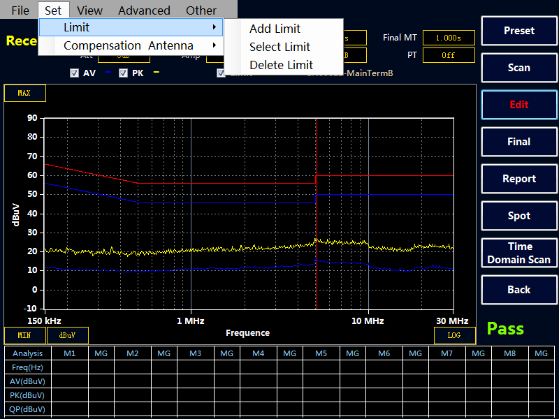 選擇“Final” 按鍵,接收機會對表格中的點進行終測,測量 PK,AV,QP 值,測量時間在Final MT 中設置。如果沒有超標點或者手動添加的測試點,Final 終測是無效的。注意:終測時請不要關閉被測設備。