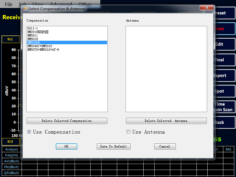 調用補償曲線時點擊“Set-Compensation Antenna-Select”,選擇所需的補償曲線。然后點選“Use Compensation”程序將應用當前補償曲線,并在表格上顯示補償的值。點擊 OK 確認。
