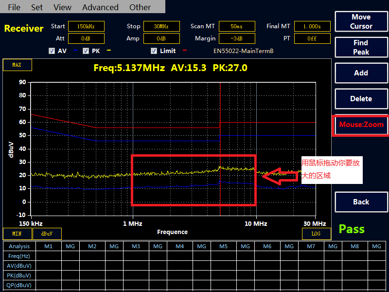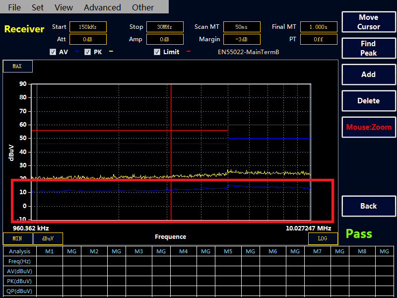 在菜單欄中點擊 Advanced——Advanced option,將 Lock Final Test Frequency 選項勾上,點擊OK,回到主界面的超標點的頻率那一欄顯示紅色,說明設置成功,然后添加自己需要的測試頻點。(在接收機掃描到 PK 值和 AV 值后,如果客戶需要一直關注的峰值點的頻率對應的 PK,AV,QP 值,可以鎖定頻率點,在下次終測時,可以固定掃描自己需要的頻點。)