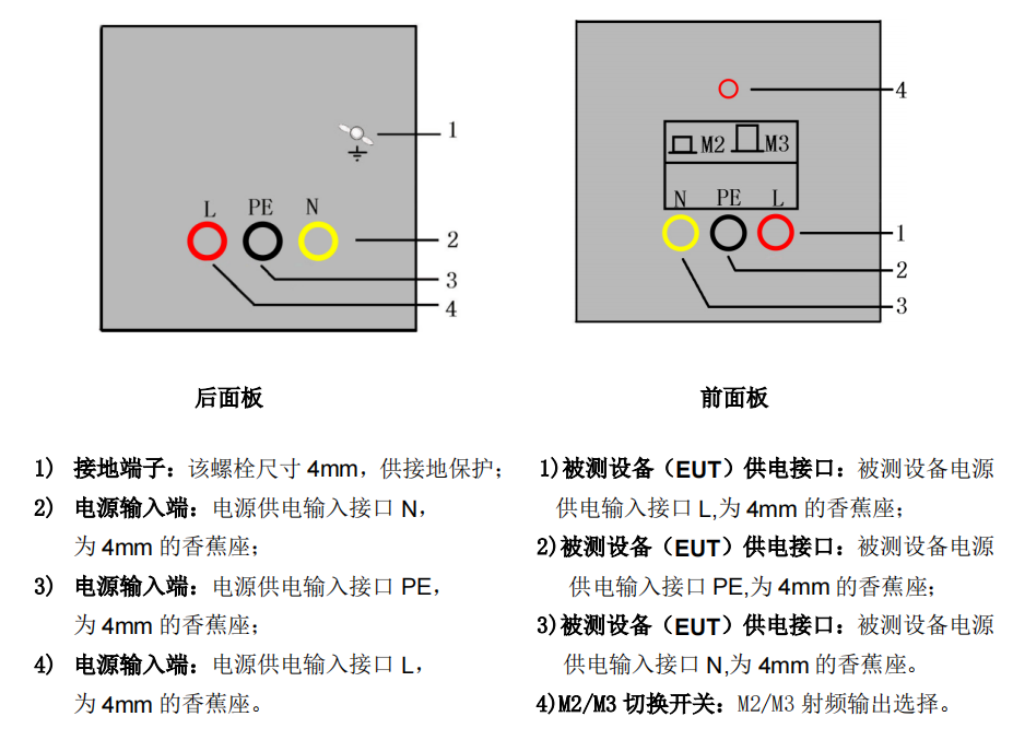 被測設(shè)備(EUT)供電接口:被測設(shè)備電源供電輸入接口,為 4mm 的香蕉座。